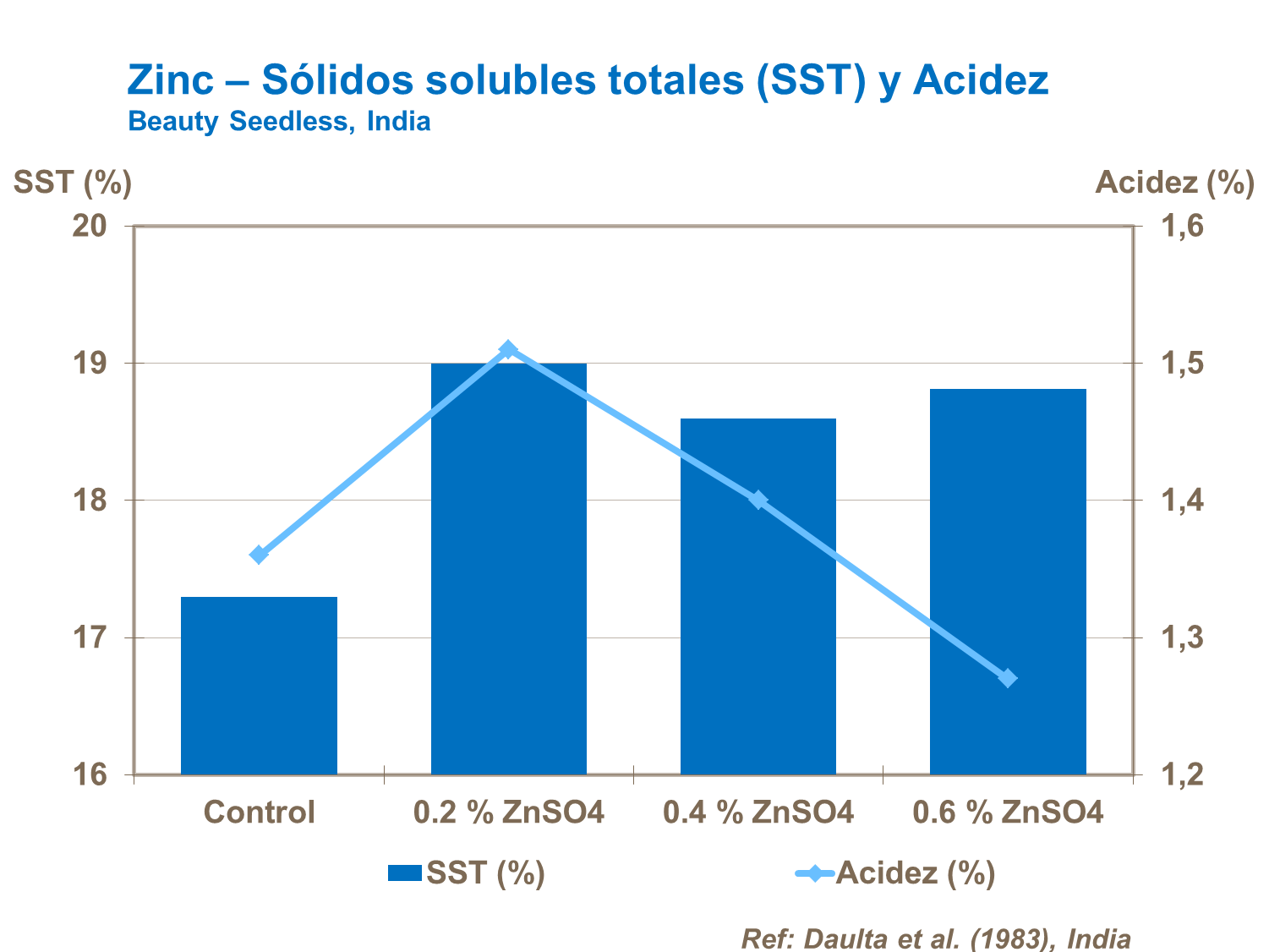 Niveles óptimos de hierro aumentaron el contenido de SST en uvas de acuerdo con ensayos realizados en India. El hierro es particularmente necesario para la producción foliar temprana y la fotosíntesis, para asegurar un mejor desarrollo y calidad de las uvas.