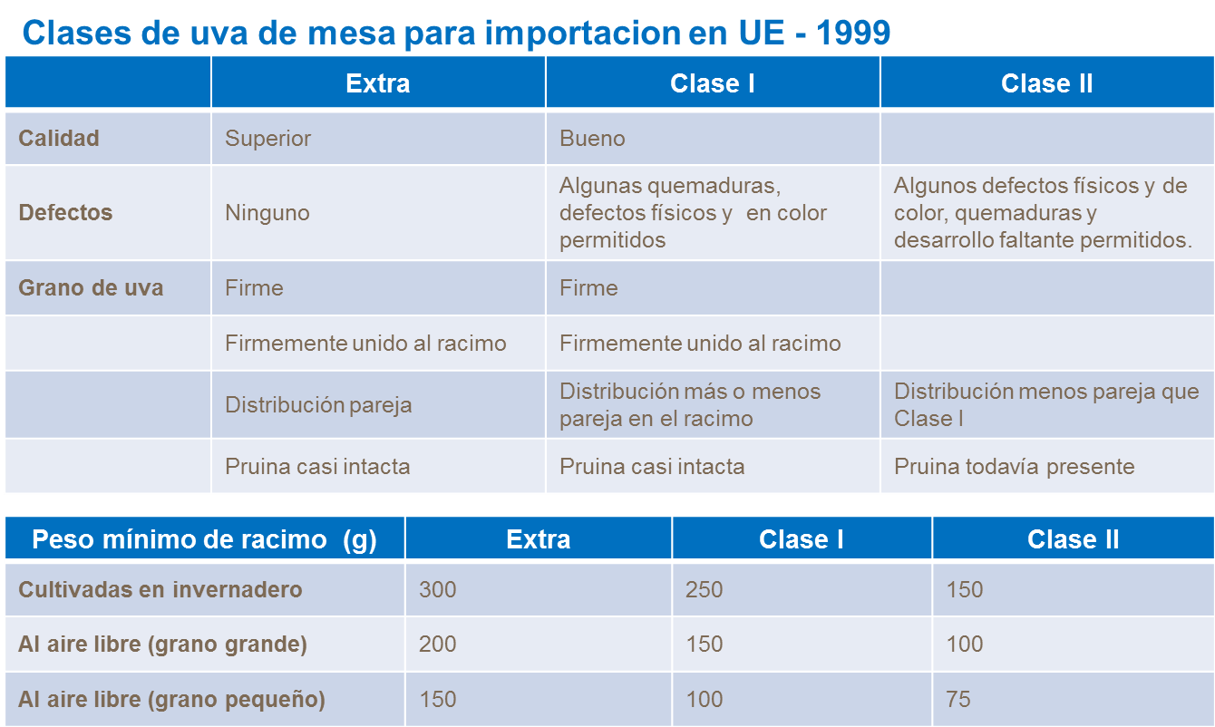 La uva se clasifica según una serie de parámetros de calidad. Existen incluso requerimientos mínimos de empaquetado y etiquetado que se deben cumplir para obtener la clasificación deseada.